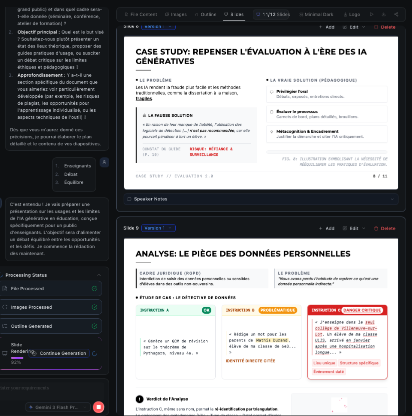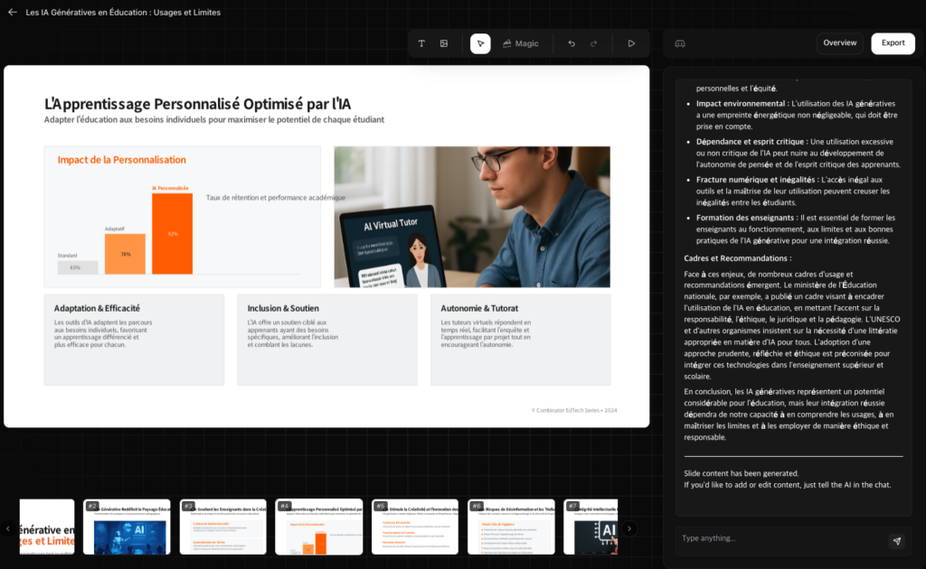 Tosea (https://tosea.ai/) génère des présnetations à partir d’un document pdf (orientation vers articles scientifiques et documents académiques) et d’un chatbot...
