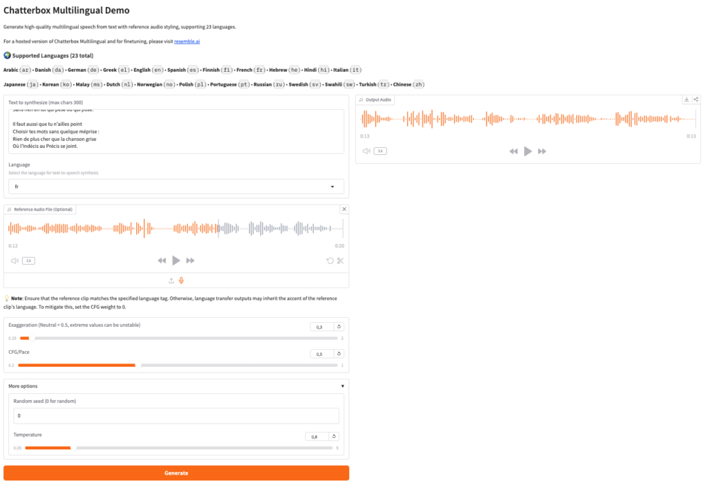Chatterbox (documentation : https://github.com/resemble-ai/chatterbox et démonstration : https://huggingface.co/spaces/ResembleAI/Chatterbox-Multilingual-TTS) est un modèle « text to speech » open source disponible en 23 langues...
