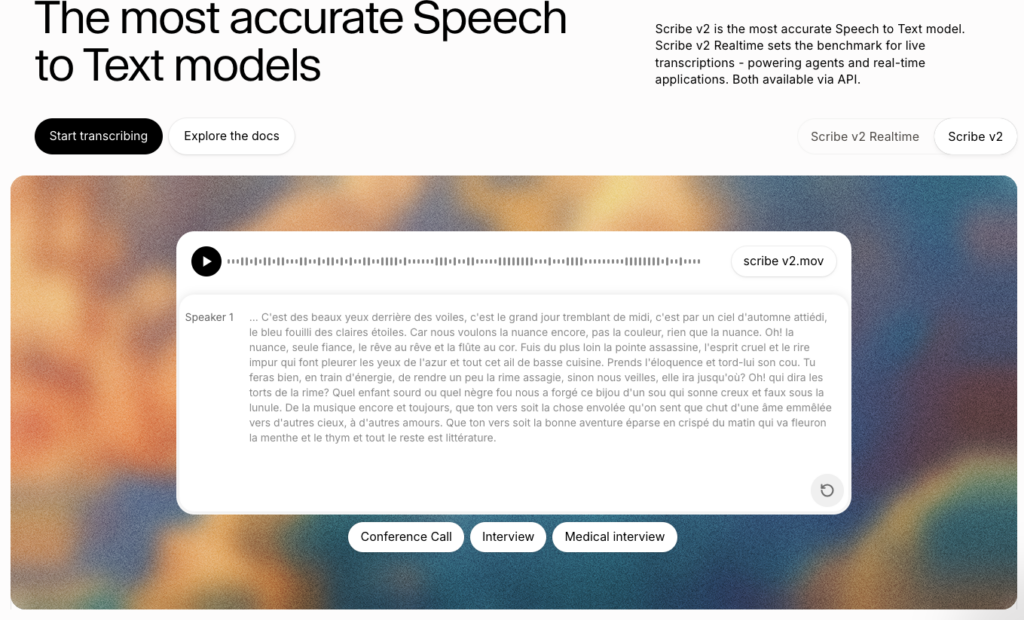 Scribe v2 d’Eleven Labs (https://elevenlabs.io/speech-to-text) est un modèle de transcription voix vers texte avec deux versions : v2 real time...