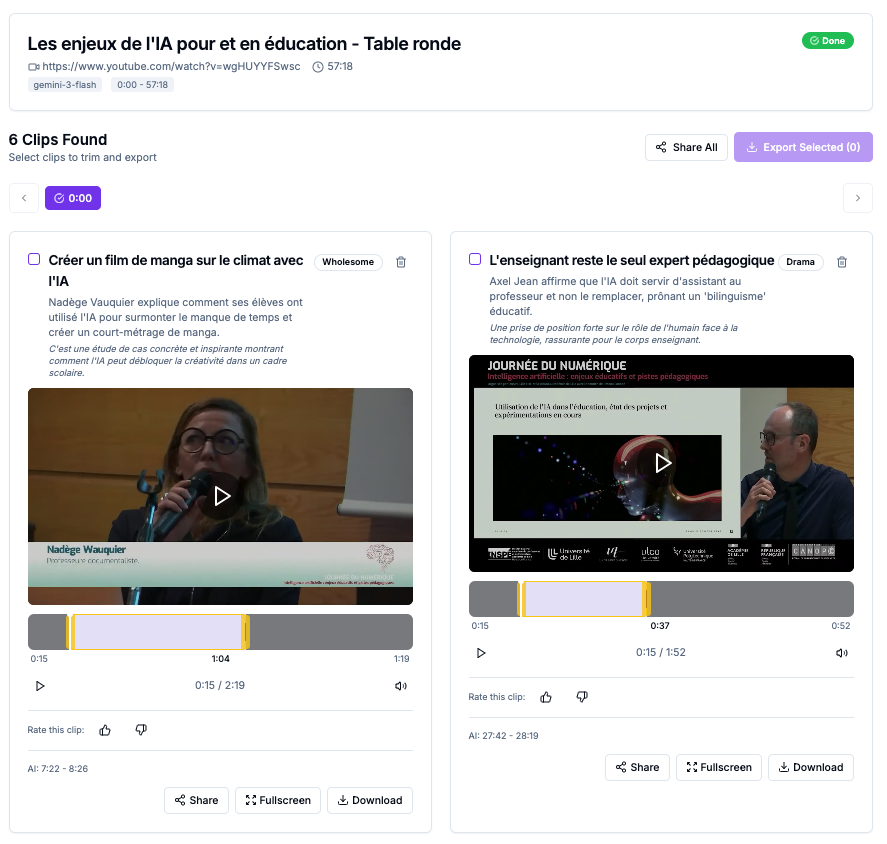 Clipfinder (https://www.clipfinder.org) génère des extraits « autonomes » à partir d’une vidéo youtube (d’autres plateformes annoncées) en se basant sur la transcription...