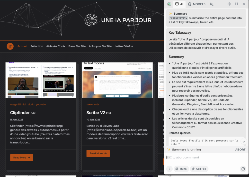 Harpa (https://harpa.ai/) propose dans une extension une palette d’outils disponibles directement dans les pages visitées. Via une barre d’outils (résumé,...