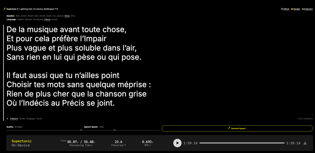 Supertonic (documentation : https://huggingface.co/Supertone/supertonic-2 et démonstration : https://huggingface.co/spaces/Supertone/supertonic-2) est un modèle « texte vers voix » qui peut être installé et s’exécuter...