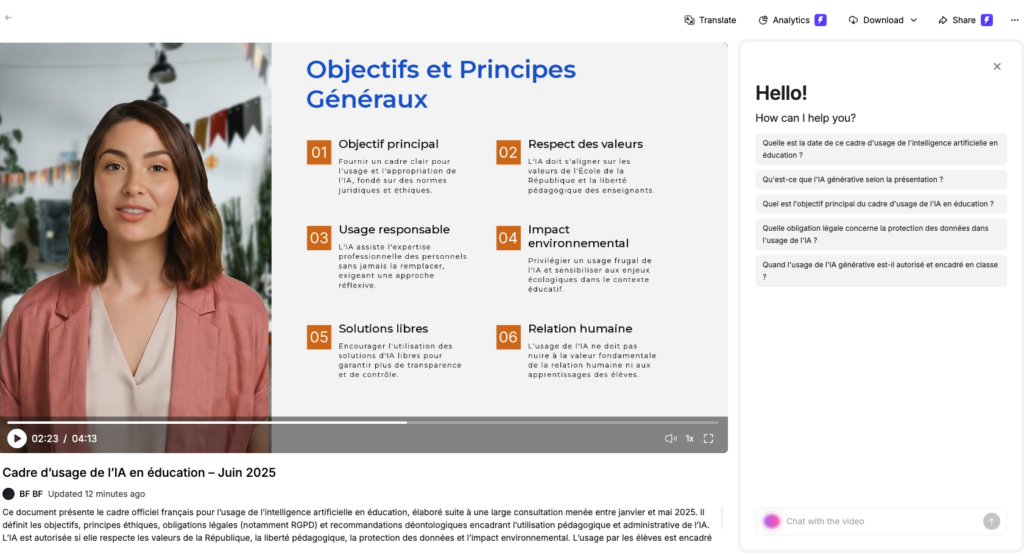 Leadde (https://leadde.ai) génère une vidéo explicative avec avatar etvoix à partir d’un document ou d’une présentation. Choix de l’avatar et...