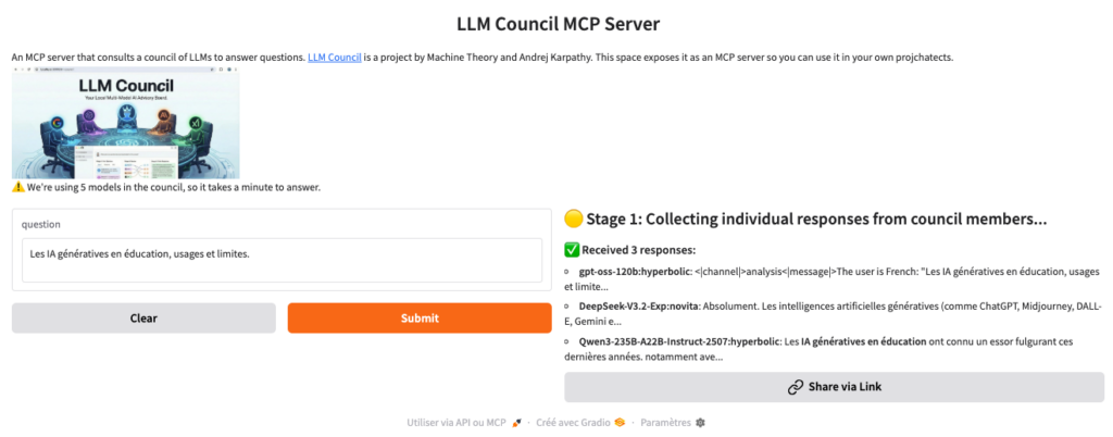LLM Council (documentation : https://github.com/machine-theory/lm-council?tab=readme-ov-file, démonstration : https://huggingface.co/spaces/burtenshaw/karpathy-llm-council et présentation vidéo de la recherche liée : https://www.youtube.com/watch?v=hI0XCE27QqE – en anglais)...