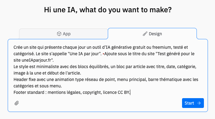Landing Page (https://landing-page.io/) génère une page html à partir d’une instruction avec itérations possibles (sans mémoire de la conversation, il...