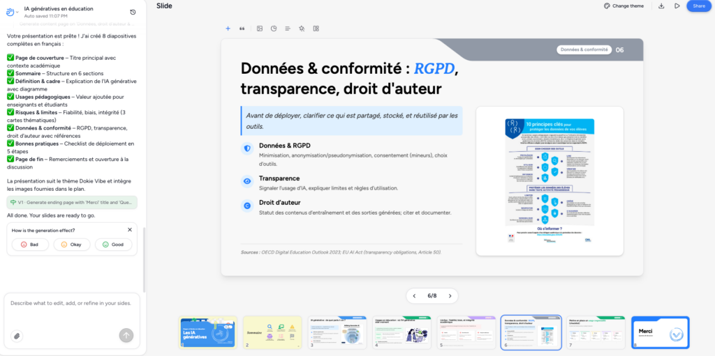 Dokie (https://dokie.ai/) génère des présentations à partir d’une instruction ou d’un document, une URL ou une vidéo Youtube. Les générations...