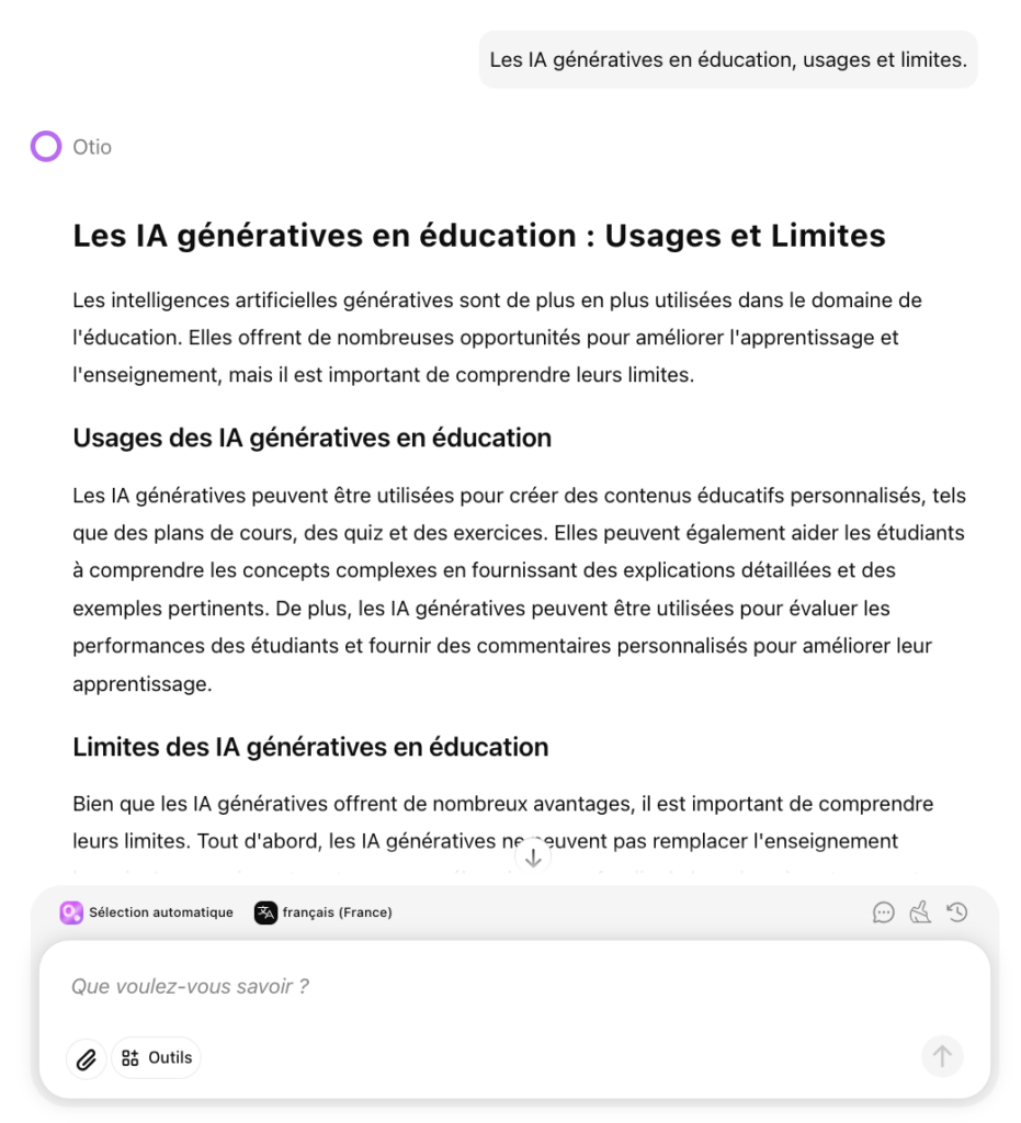 Otio (https://otio.ai/) est un chatbot orienté analyse de documents et recherche web à partir de 40 modèles de langage à...