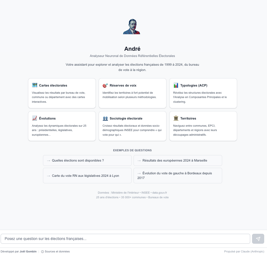 André (https://andre.vote/) est un chatbot spécialisé sur l’analyse électorale en France et alimenté sur 4 sources de données ouvertes couvrant...