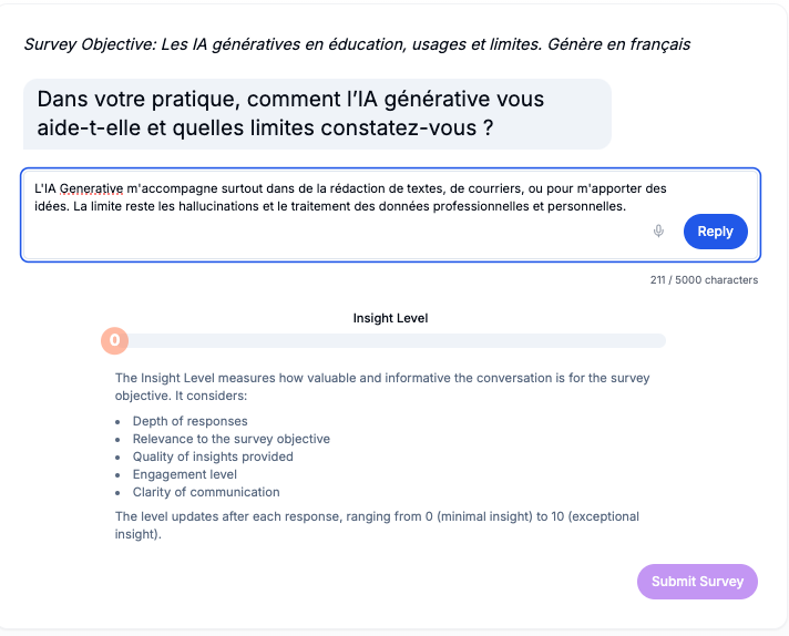 Parliant (https://www.parliant.ai) ets une application d’enquêtes et de sondages où l’IA générative peut produire le texte des questions ouvertes à...