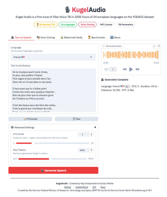 Kugel Audio (documentation : https://github.com/Saganaki22/ComfyUI-KugelAudio et démonstration : https://huggingface.co/spaces/multimodalart/kugelaudio) est un modèle de synthèse vocale (texte vers voix) incluant 24...