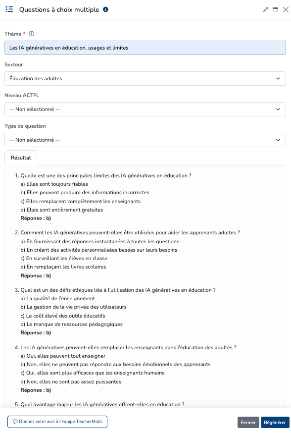 Teachermatics (https://teachermatic.com/) regroupe un ensemble de générateurs dédiés à l’enseignement (plus de 80 : plans de cours, quizz, flashcards, questions,...