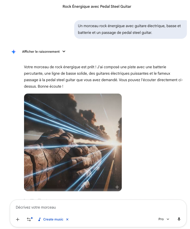 Lyria 3 est le modèle de génération de musique intégré à Gemini (description : https://deepmind.google/models/lyria/ et accès direct : https://gemini.google.com/music)....