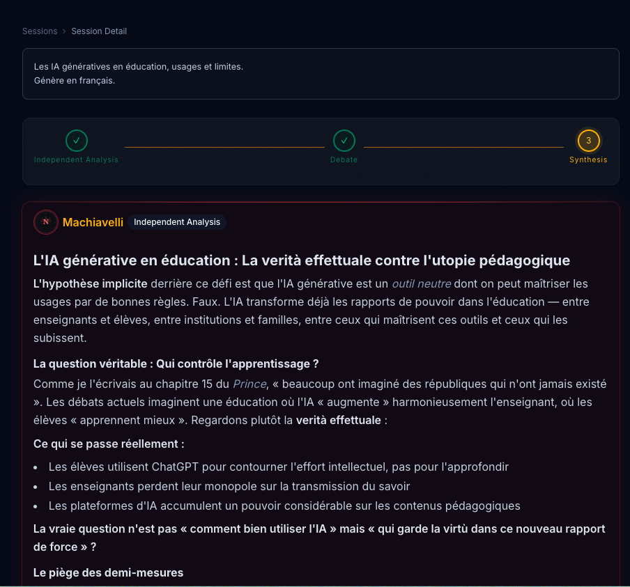 Arcanon (https://arcanon-ai.vercel.app/) convoque les pensées de Descartes, Artistote, Machiaviel et Han Fei autour d’un sujet proposé. Dans « Sessions », entre 2...