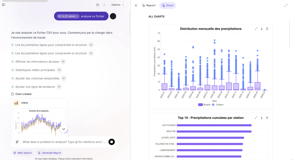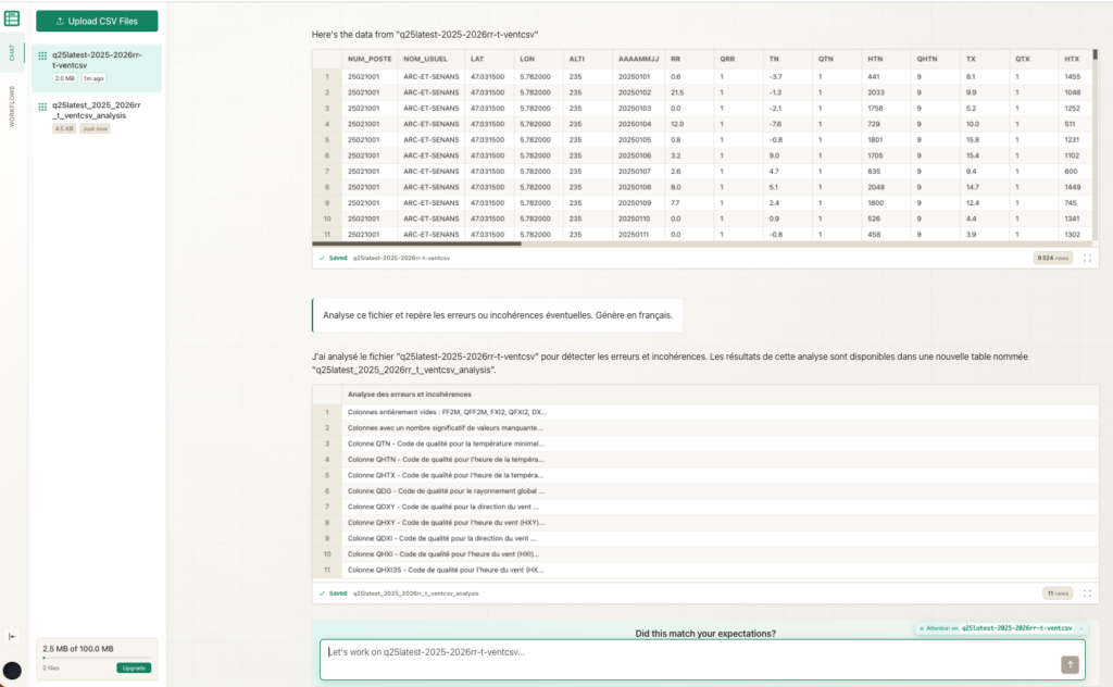 Comabot (https://commabot.com/) analyse des fichiers csv à partir d’instructions. Les réponses apportées sont agrégées dans de nouveaux fichiers csv intégrés...