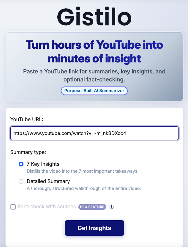 Gistilo (https://gistilo.com) résume des vidéos Youtube. Deux modes proposés : les 7 points saillants et résumé détaillé. Pour les vidéos...