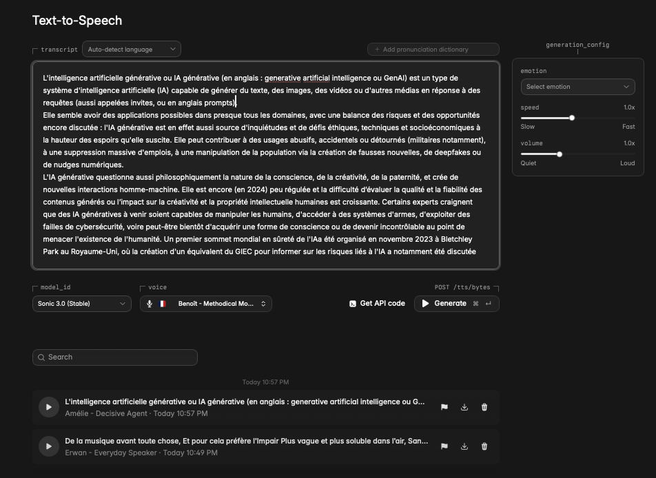 Cartesia (https://cartesia.ai/sonic) est une application modèle « Texte vers voix « déployés avec deux versionq : un version génération de texte et...