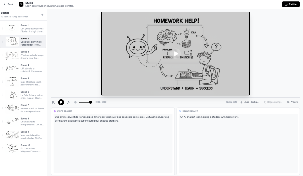 Knowlify (https://www.knowlify.com – choisir « Plateform ») géère des vidéos explicatives à partir d’une instruction et d’une voix choisie. Le script éditable...