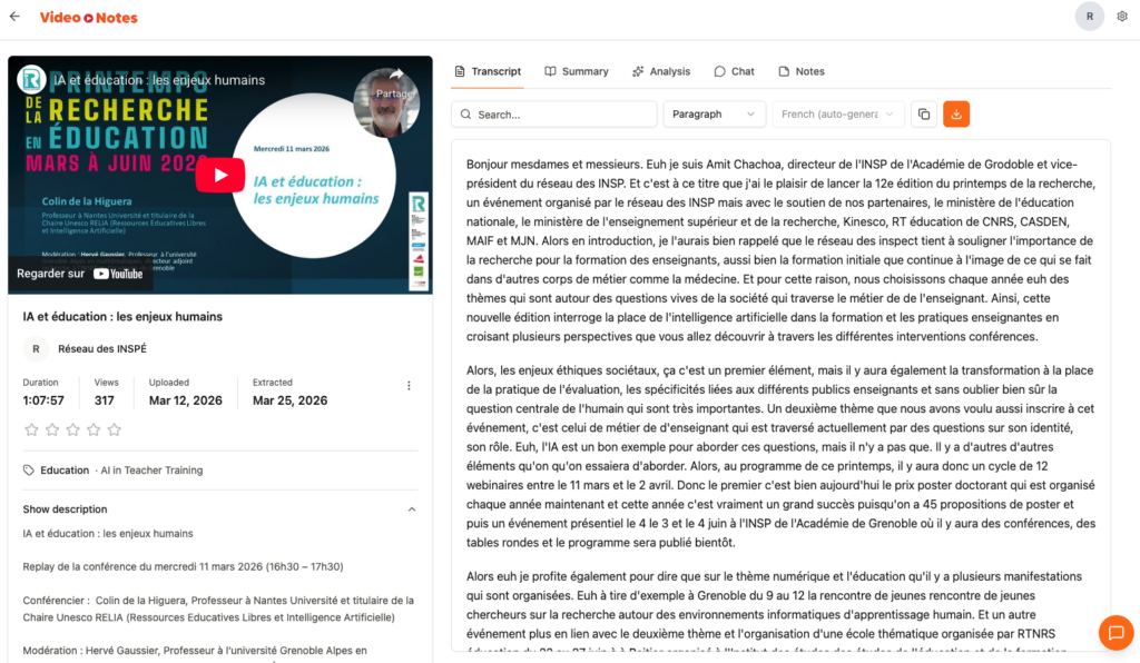 Video notes (https://www.video-notes.co/) propose l’analyse de vidéos youtube avec transcription, résumé détaillé, analyse, chatbot et notes. Export markdown et txt....