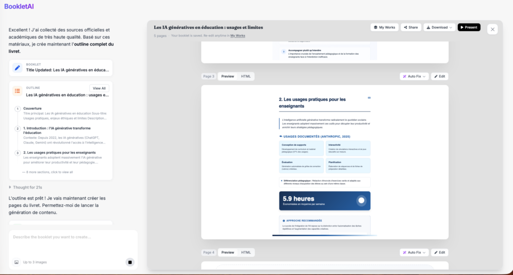 BookletAI (https://bookletai.org) génère des « livrets » sous forme de pages html qui se tournent ou de pdf qui peuvent être partagés...