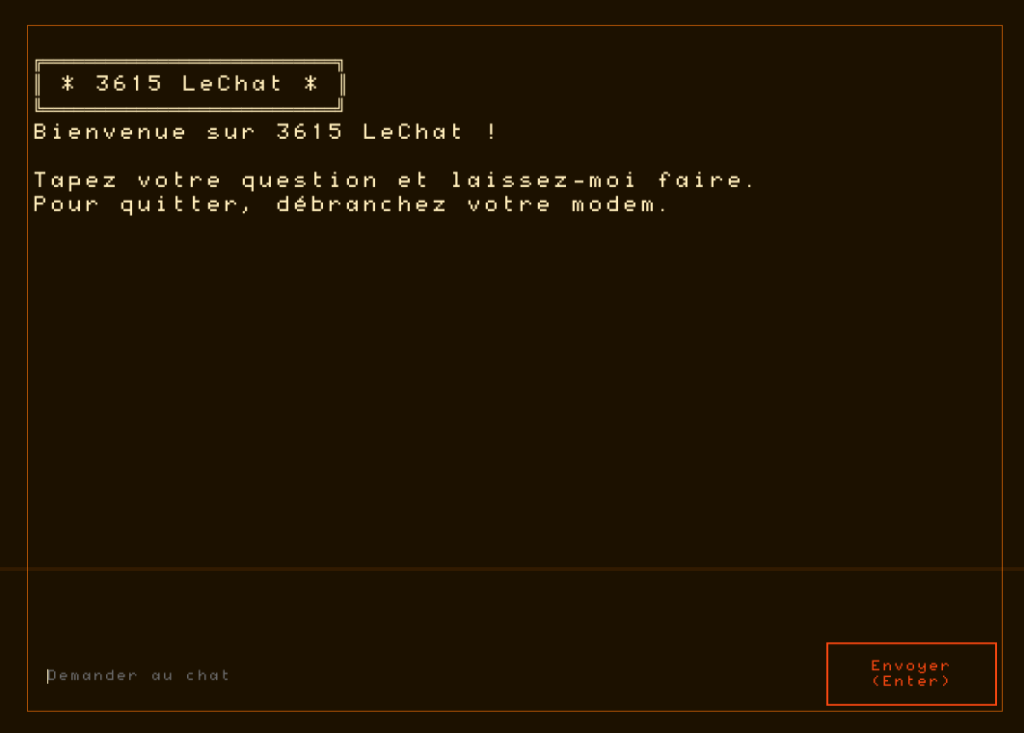 3615 LeChat (https://3615-lechat.wildcode-solutions.com/) propose le modèle de langage Mistral dans une interface inspirée du… Minitel ! Police, couleur, vitesse… tout est présent pour un retour dans les années 1980.