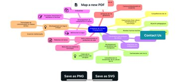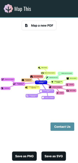 Map This (https://map-this.com) génère une carte heuristique à partir d’un pdf. Pdf jusqu’à 5Mo et 50 pages. 5 générations par mois. Export png ou svg. Tests : orientations Unesco (https://unesdoc.unesco.org/ark:/48223/pf0000386693_eng) et infographie Canopé (https://reseau-canope.fr/agence-des-usages/intelligence-artificielle.html)
