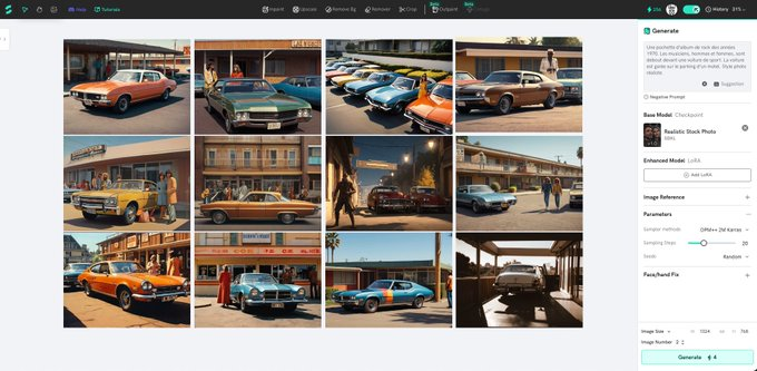 Shakker (https://shakker.ai/aigenerator) regroupe des modèles de génération d’images (Stable diffusion et modèle interne) avec filtres et fonctions avancées. Outils d’agrandissement et de retouche. 300 crédits gratuits puis 200/mois (5 environ par génération).