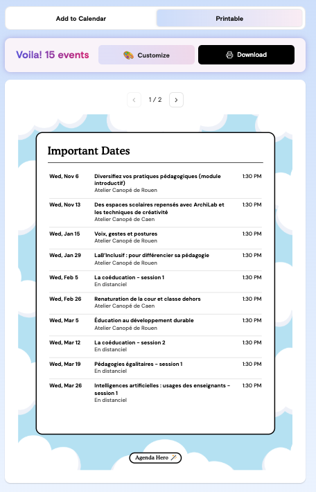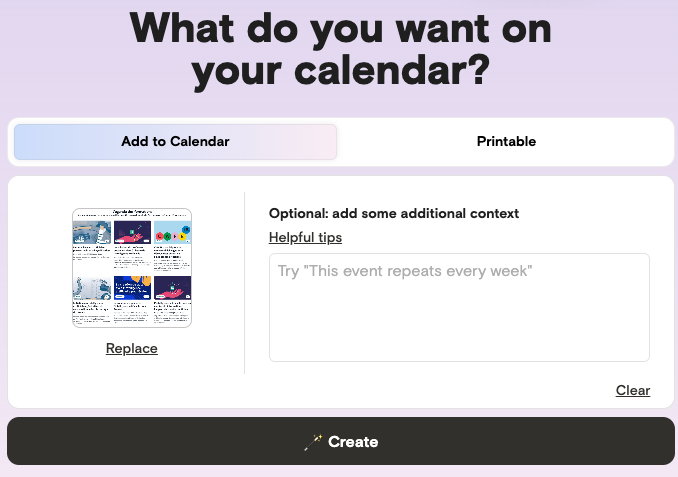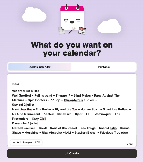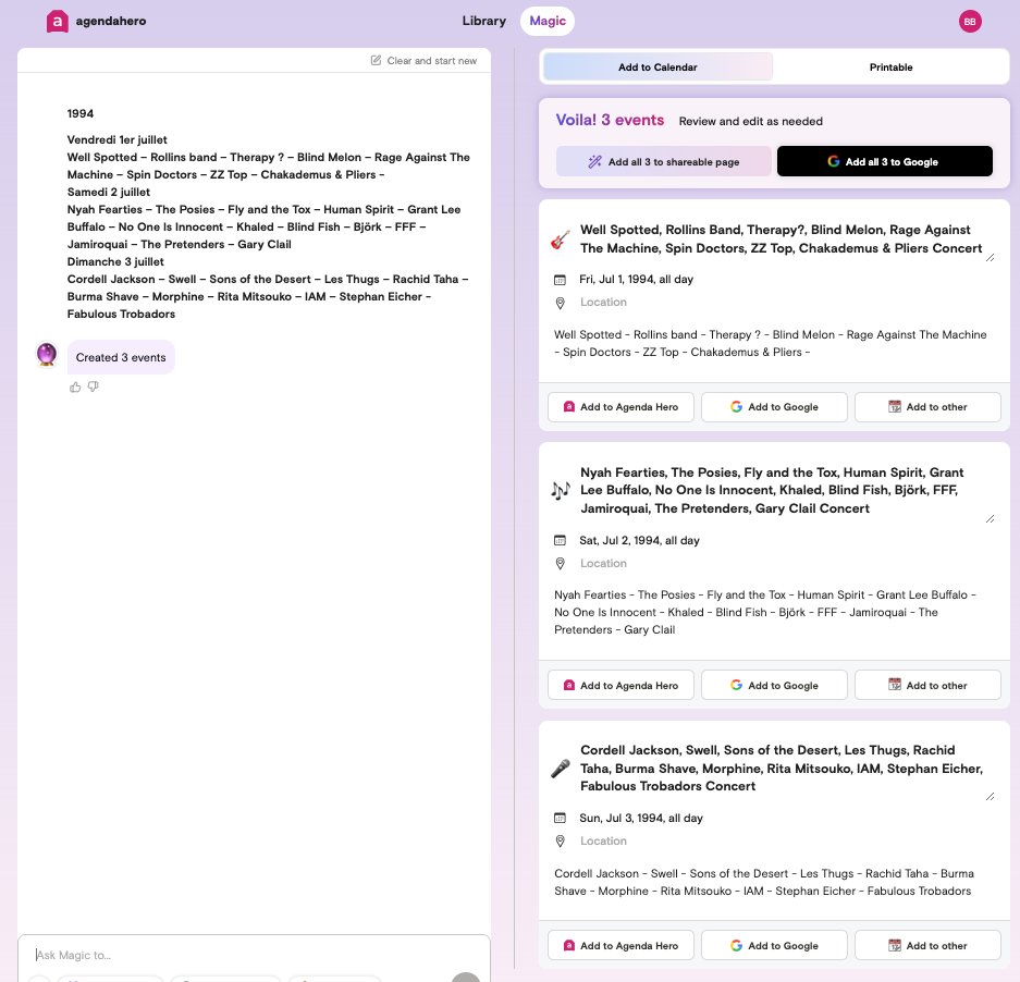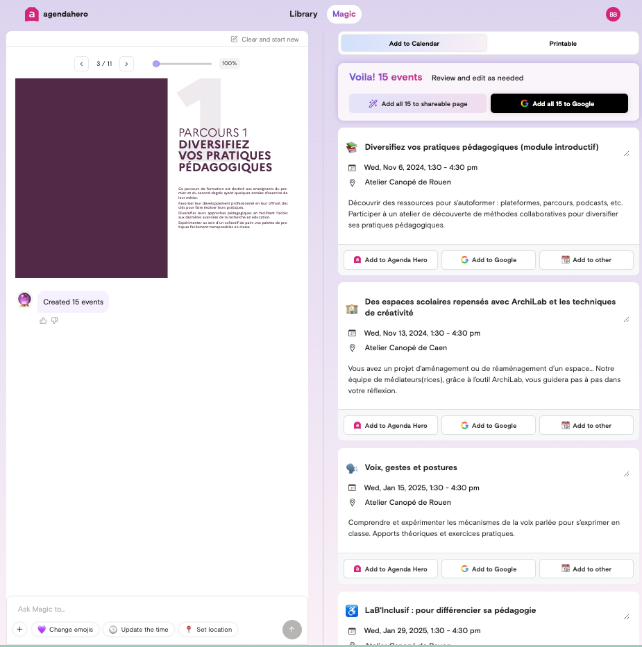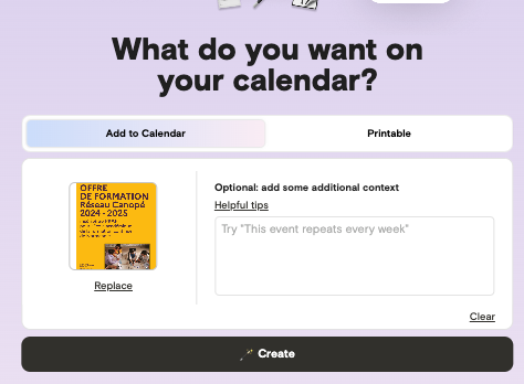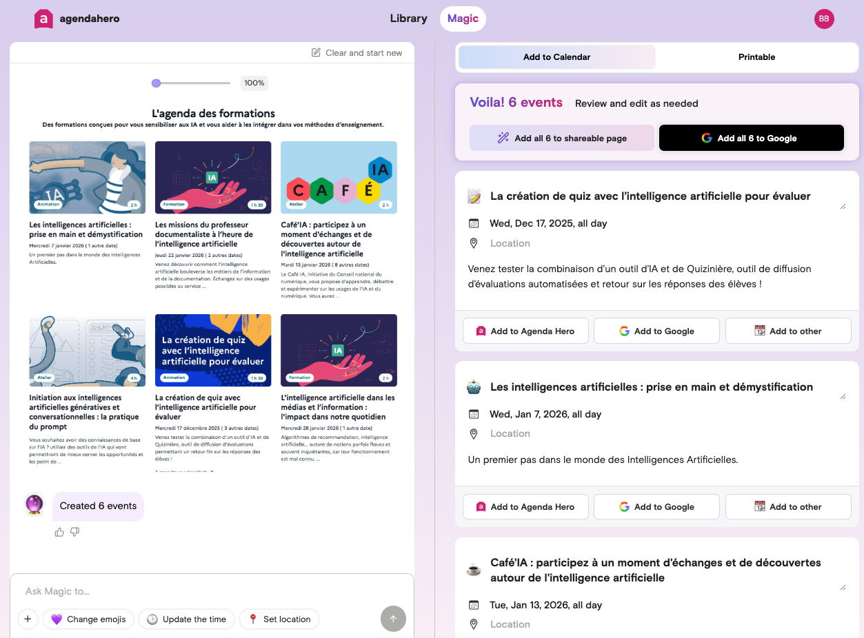 Magic de Agenda Hero (https://agendahero.com/) transforme les événements, titres, dates et lieux, présents dans un texte, un image ou un pdf en une liste d’évenements de calendrier.