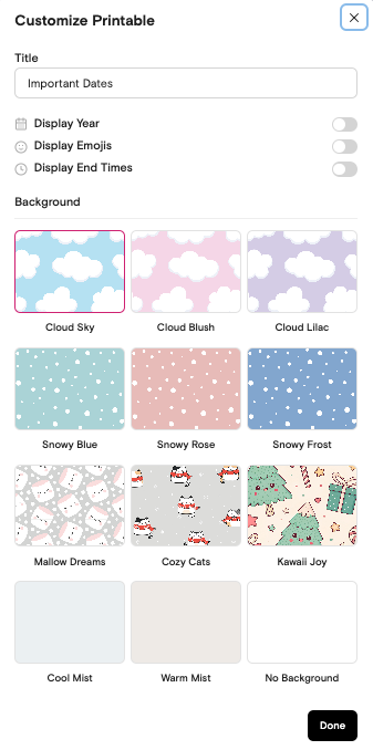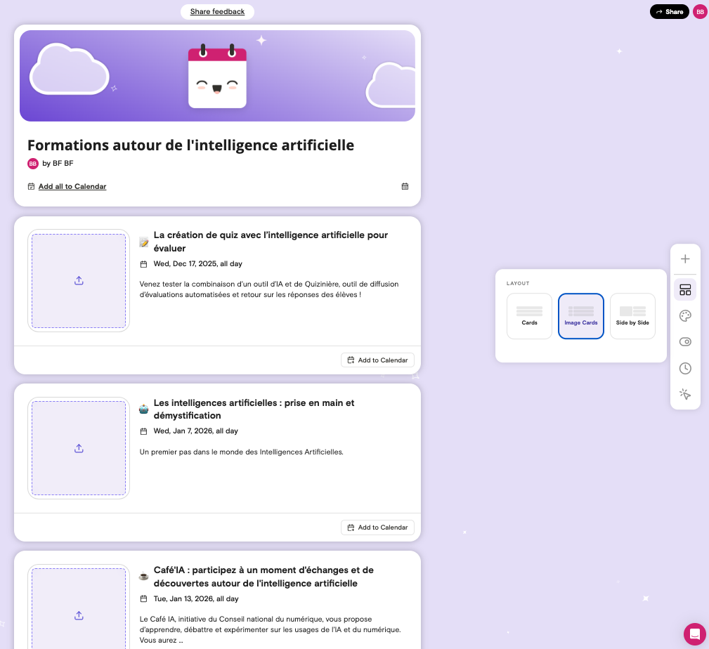 La liste créée peut être publiée sur une page web éditable et partageable, sur un agenda en ligne (Google, Apple, Outlook, export format ics) ou en une version imprimable.