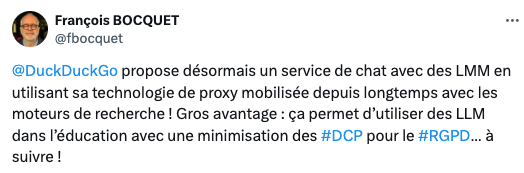 AI Chat de @DuckDuckGo (https://duckduckgo.com/?q=DuckDuckGo+AI+Chat&ia=chat&duckai=1) propose 4 LLM (GPT 3.5 et claude, Llama, mixtral en versions légères) avec confidentialité. Pas d’historique, non connecté. Gratuit et sans compte. Via @benovigo + @a_happy_teacher