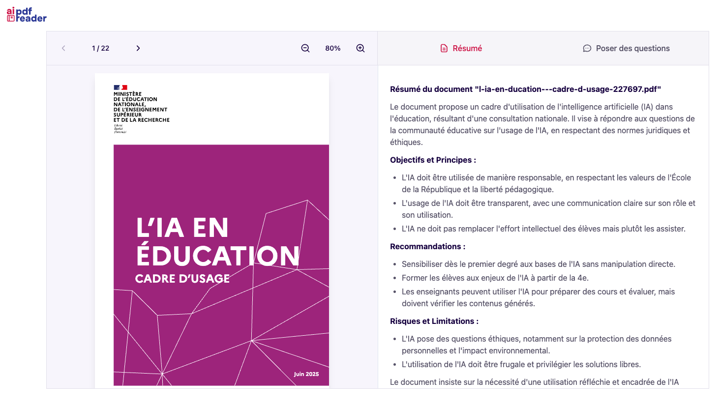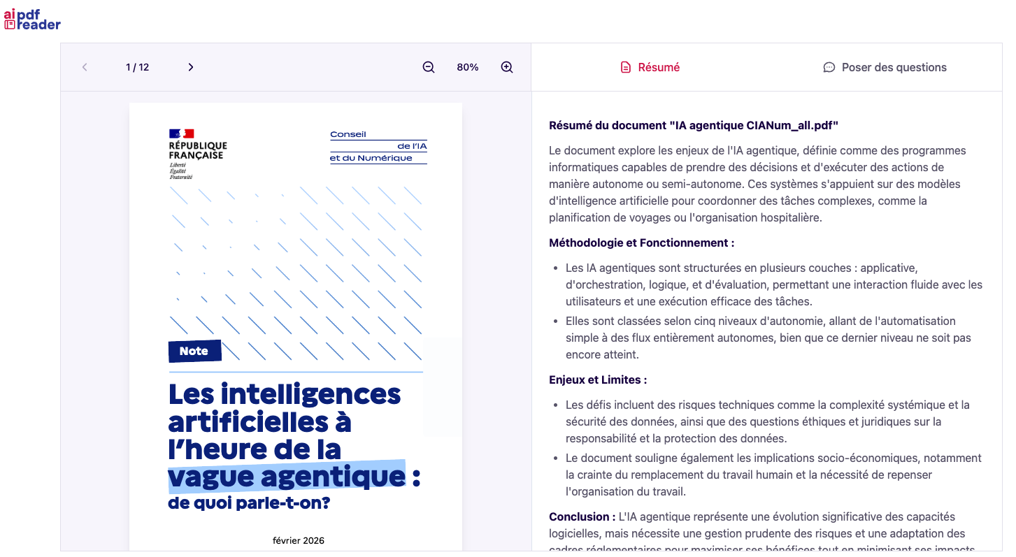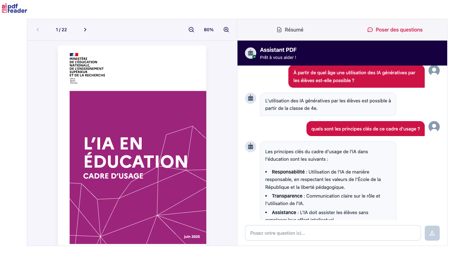 Ai pdf reader (https://aipdfreader.net/fr) résume des documents pdf et permet de les interroger via un chatbot.