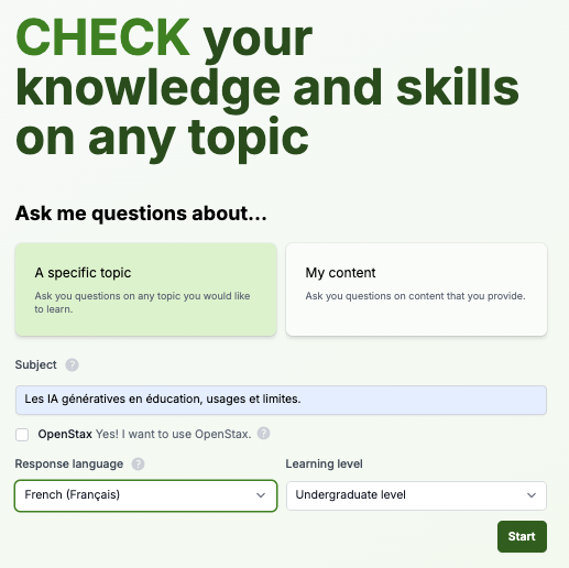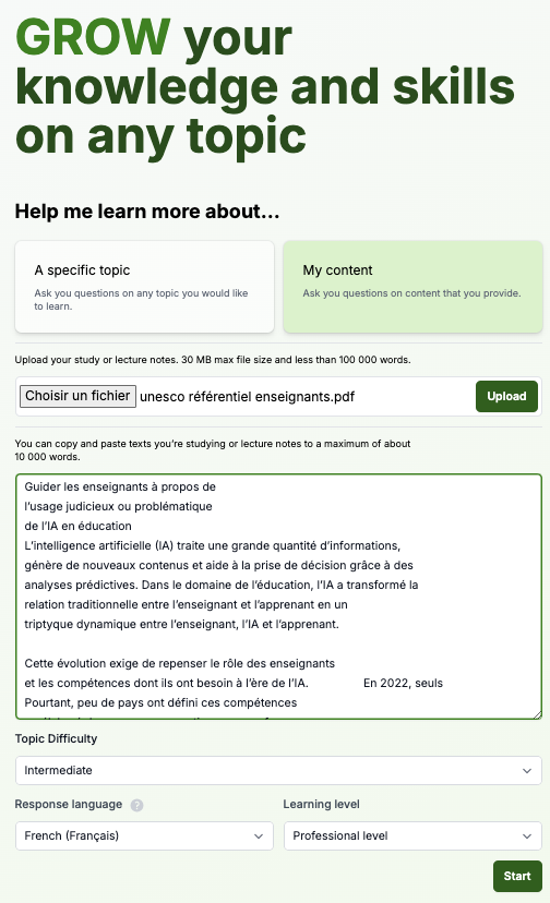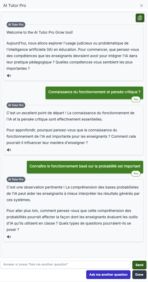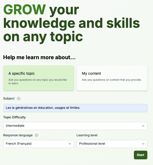 AI Tutor pro (https://www.aitutorpro.ca) est un chatbot qui propose deux approches basées sur le questionnement à partir d’un sujet, « Grow » et « Check » :