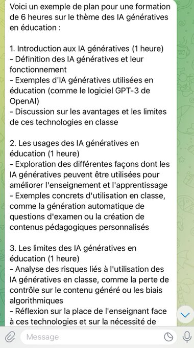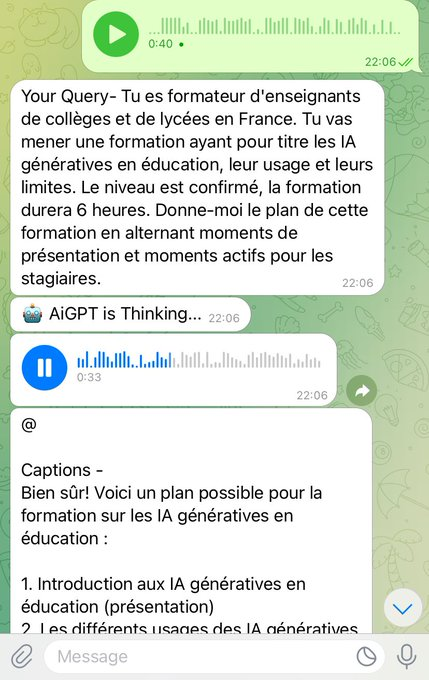 AiGPT (http://aigptfree.com) est un chatbot texte et images sur Télégram avec plusieurs modèles (GPT 3.5 et 4, llama, mistral, dall-e, SDXL). Des fonctionnalités HS lors du test (fichiers pdf et url, aide au prompt). En EN, FR ok. Gratuit et illimité.