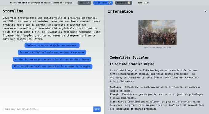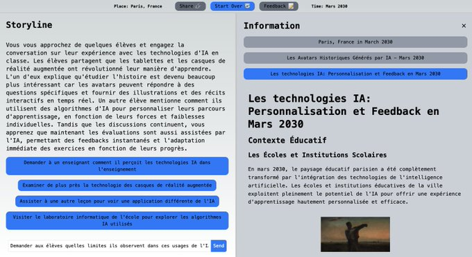 Amnesia (https://playamnesia.com) génère des histoires interactives dont vous êtes le héros, historiques ou de science-fiction, avec contextualisation. Entrée par thème ou lieu/période. Choix boutons ou chat. Génère en FR si spécifié. Sans compte et illimité.