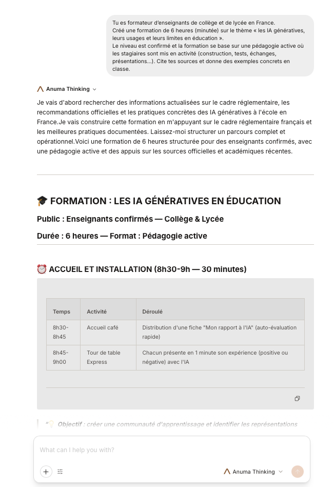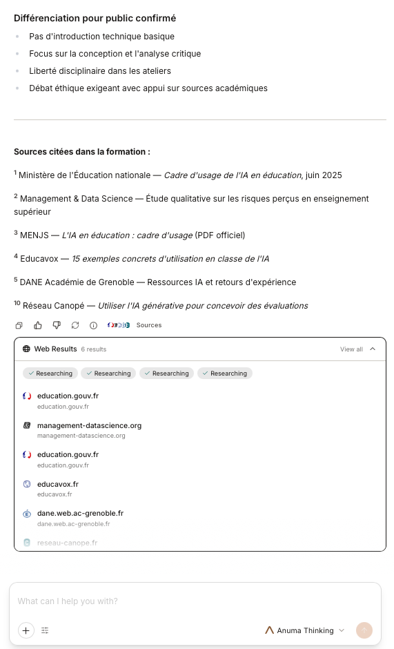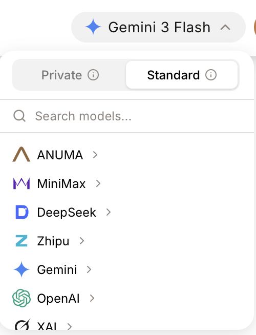 Le mode privé est basé sur deux modèles « maison » : Anuma Fast et Anuma Thinking et promet une utilisation sans captation de données. La mode public inclut la majorité des modèles performants chinois ou américains.