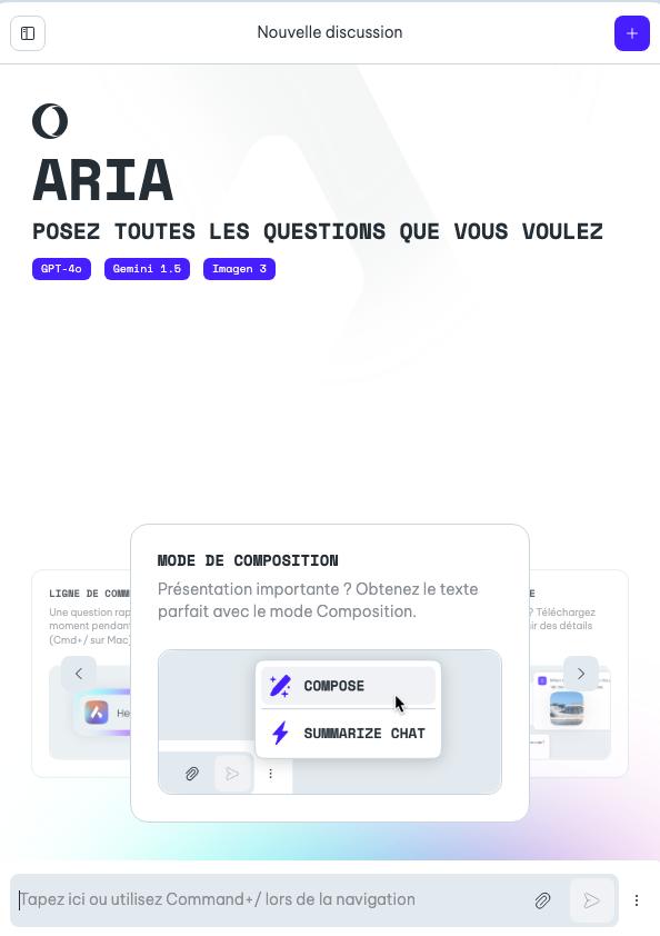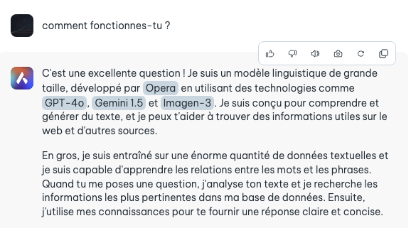 Aria est un chatbot intégré au navigateur Opera (https://www.opera.com/fr) et basé sur ChatGPT 4o, Gemini 1.5 et Imagen 3.