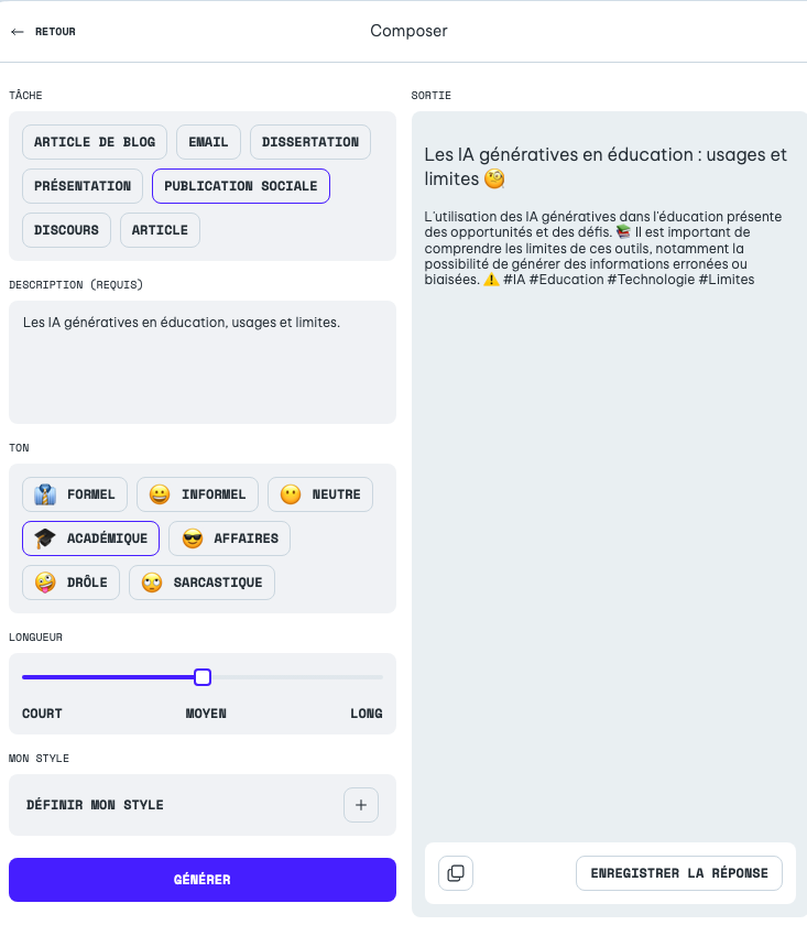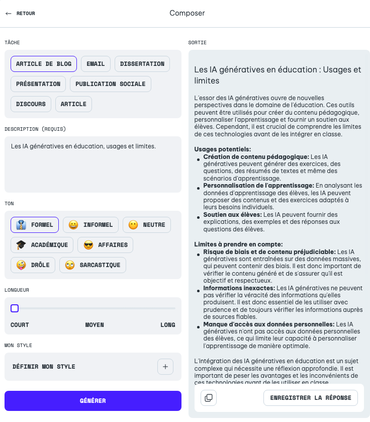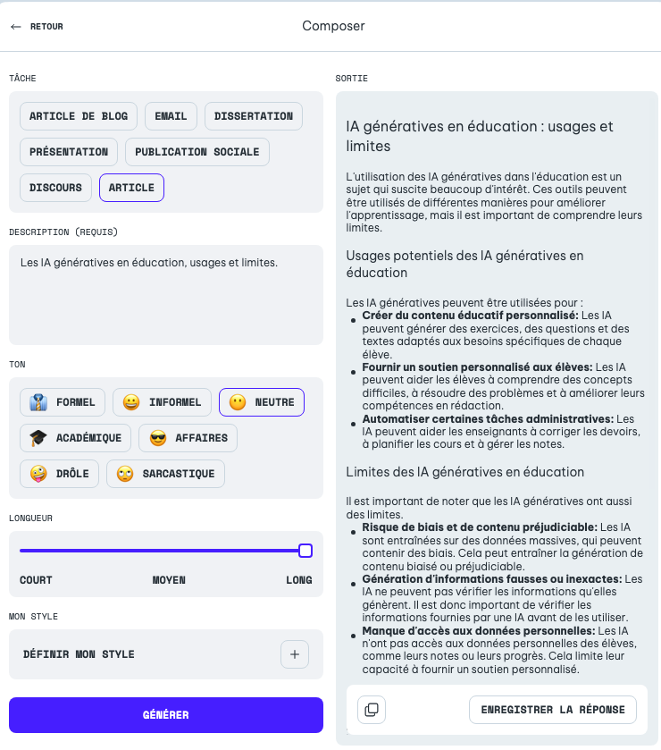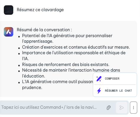 Fonctions « classiques » d’un chatbot : génération de texte à partir instructions, analyse d’images (pas documents) avec génération d’images. Fonctions additionnelles avec le mode de composition (type et longueur de texte avec possibilité de personnaliser son propre style) et résumé de conversation.