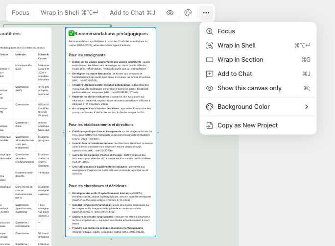 Les éléments peuvent être générés via le chatbot (modèles de Claude, Gemini et ChatGPT disponibles) ou créés librement sur le tableau.