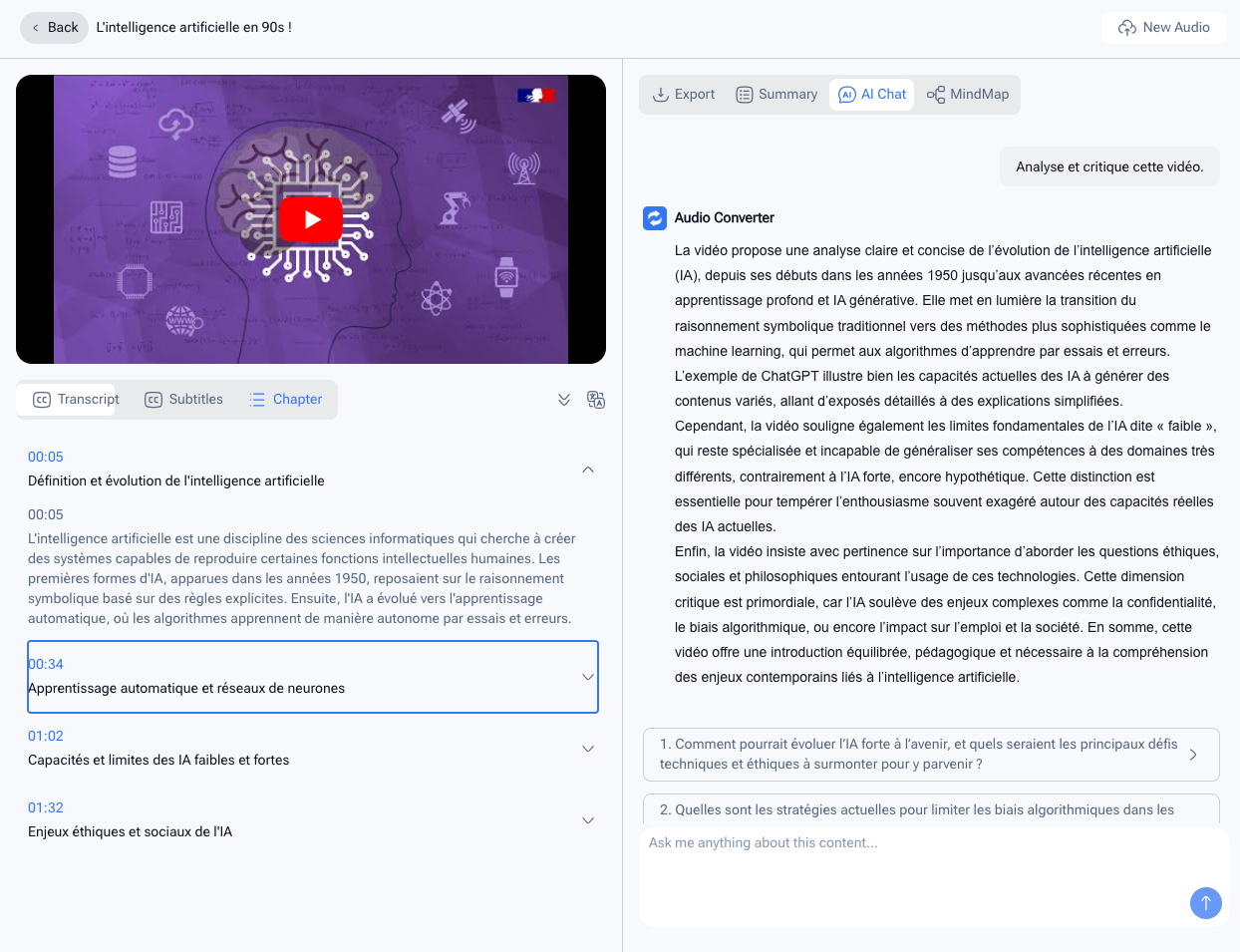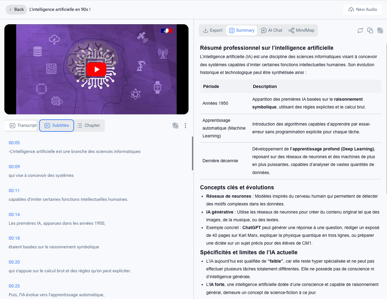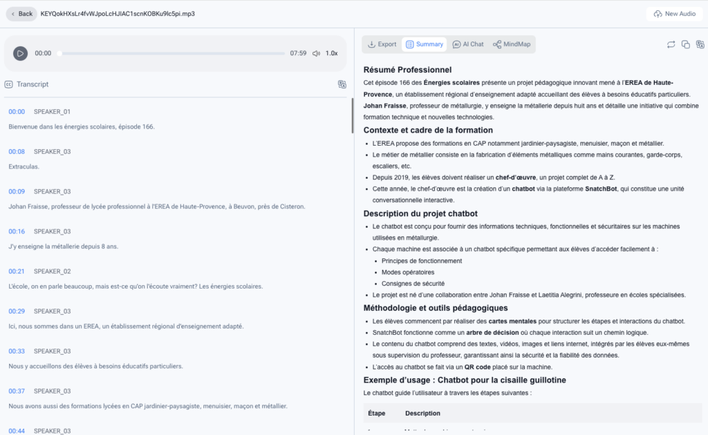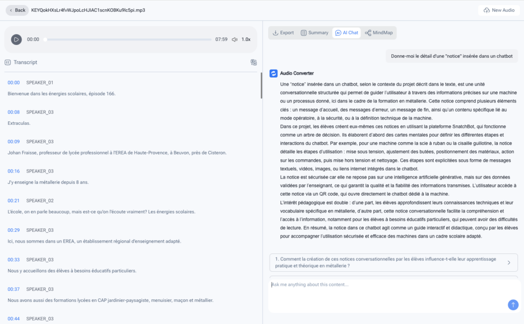 Audio Converter (https://audioconverter.ai/) transcrit de l’audio issu d’un fichier, d’une vidéo youtube ou d’une url puis en propose l’export, un résumé texte ou carte mentale et l’interrogation via un chatbot.
