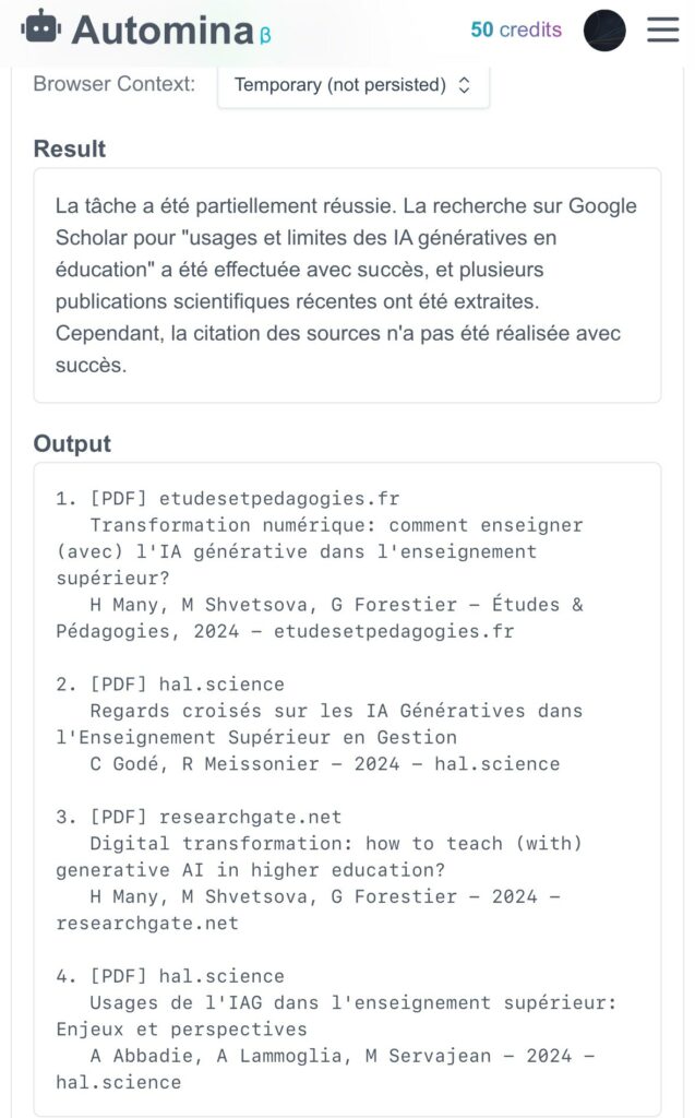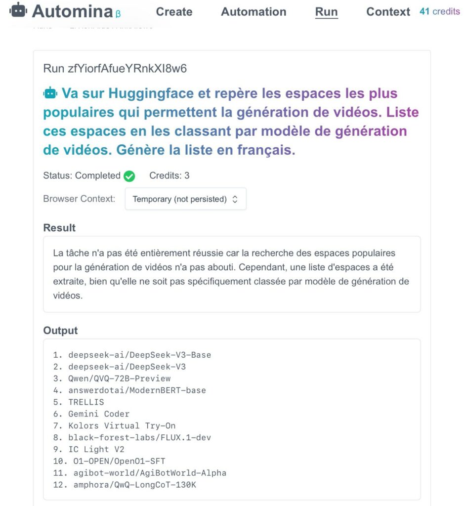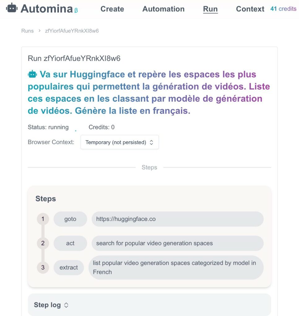 Automina (https://automina.app) automatise une navigation internet complexe à partir d’une instruction après un découpage par étape (ajout possible). Suivi en direct dans un navigateur. Beta gratuite avec 50 crédits (1 étape = 1 crédit)