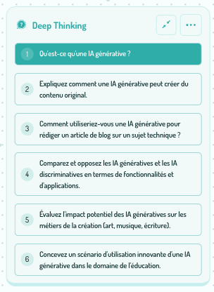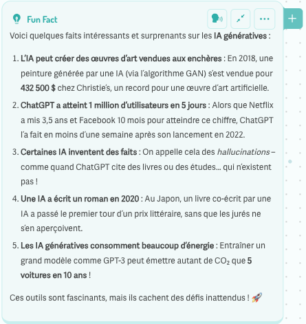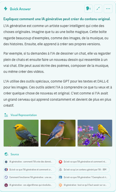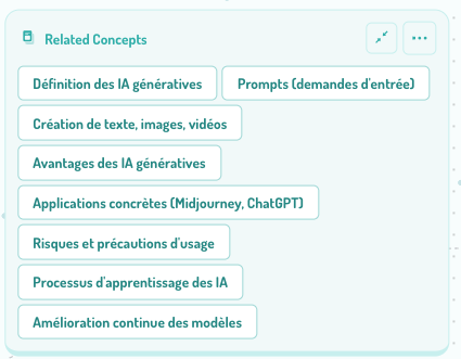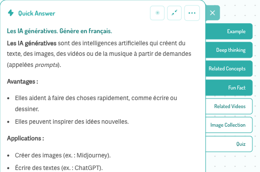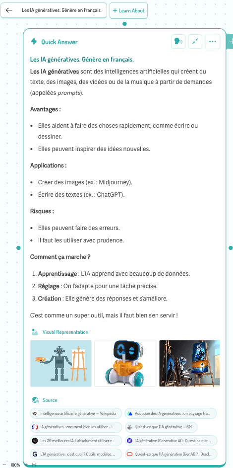 « Learn about » se présente comme une grande carte mentale où les génération successives peuvent être organisée : génération à partir du sujet avec images et sources, recherche approfondie, sujets liées, quiz et faits surprenants (vidéos et images liées en version payante).