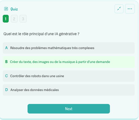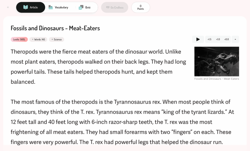 Big read (https://app.bigread.ai) propose d’accompagner les progrès en lecture des jeunes anglophones. Dans ses trois entrées – découvrir d’un sujet, lire et écrire avec l’IA -, la première « Learn about » peut être utilisée en français en ajoutant « Génère en français » dans l’instruction.