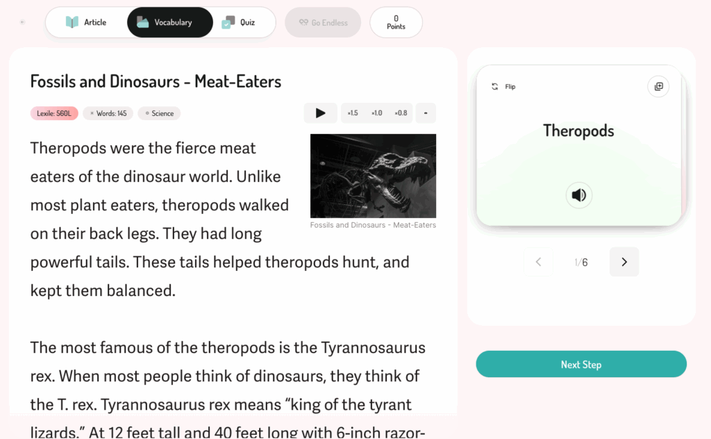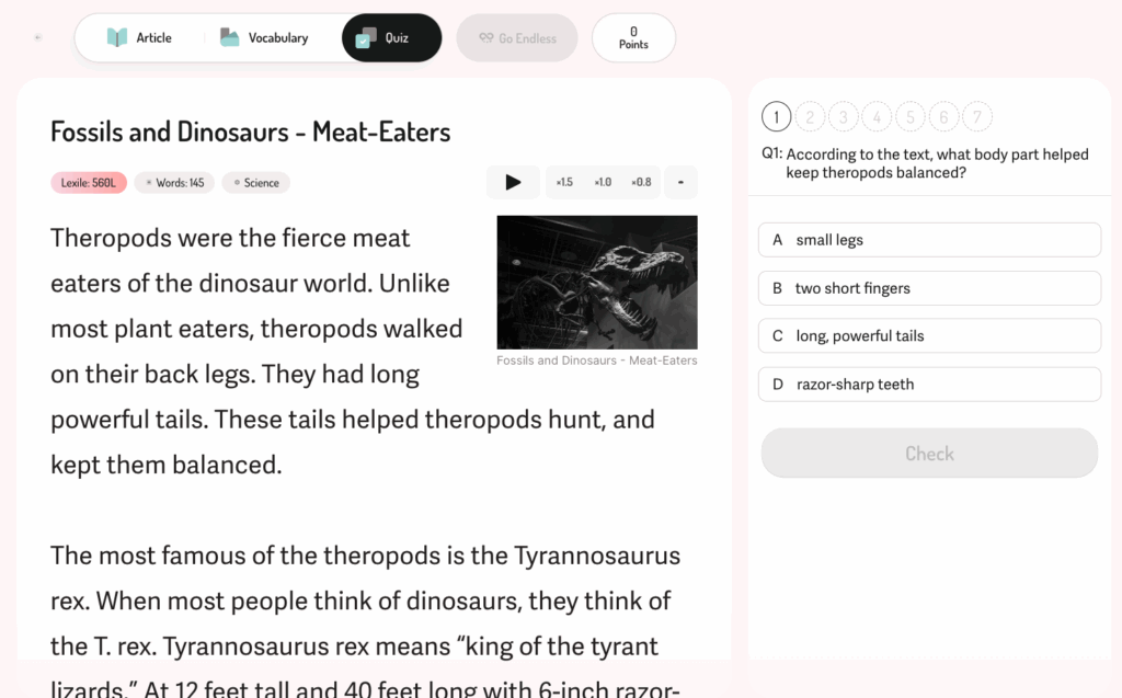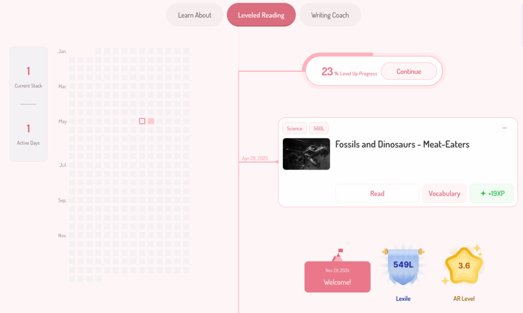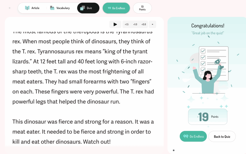« Leveled reading » pourrait être utilisé avec des enfants déjà lecteurs en anglais, elle repose sur un texte (texte lu en version payante), des flashcards audio et un quiz. Un tableau de suivi est proposé au fil des lectures / quiz.