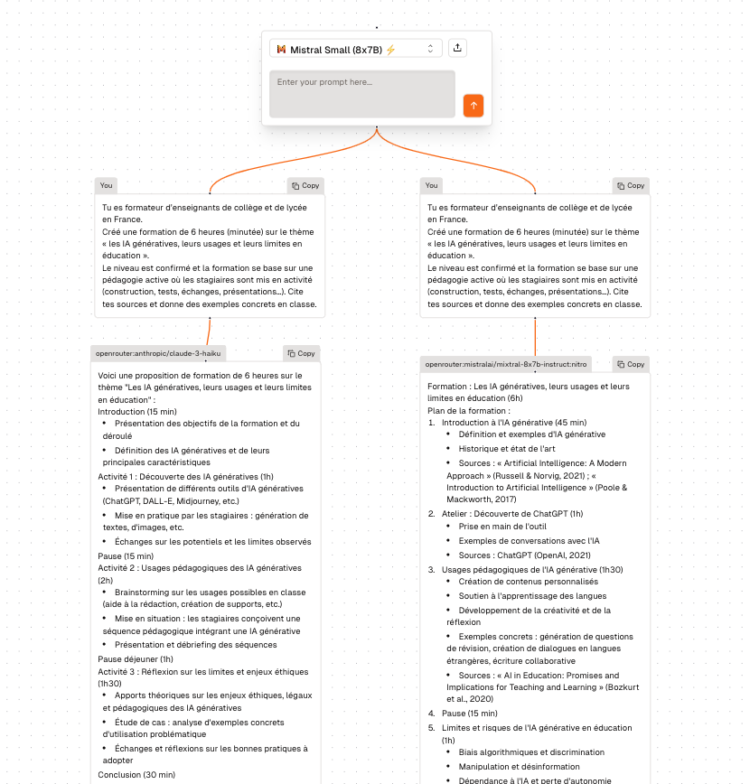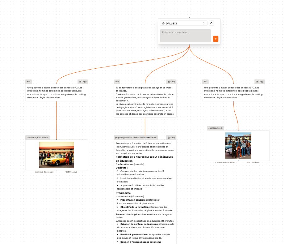 Blend (https://tryblend.ai) : un chatbot embarquant LLM et modèles d’images (dont la majorité gratuits) dans la même interface. Un mode « graph » intéressant pour comparaison. 1000 crédits pour les modèles payants. Stable vidéo HS lors du test