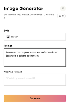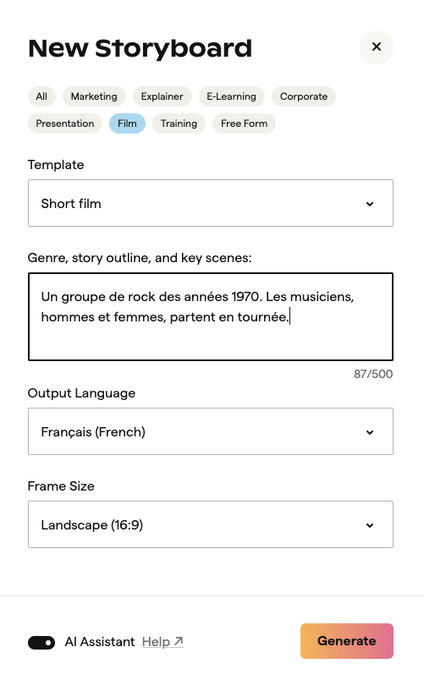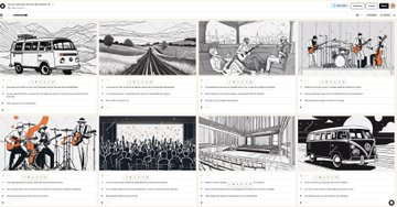 Boords (http://boords.com) génère des storyboards éditables et personnalisables avec génération des textes et des images. Exports dans version payante, partage url, animation. Crédits pour 1 storyboard gratuit. Test https://app.boords.com/s/mlv3lo