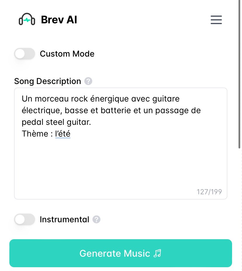 Brev AI (https://brev.ai) génère des morceaux de musique à partir de requête ou paroles fournies. 2 morceaux par génération.