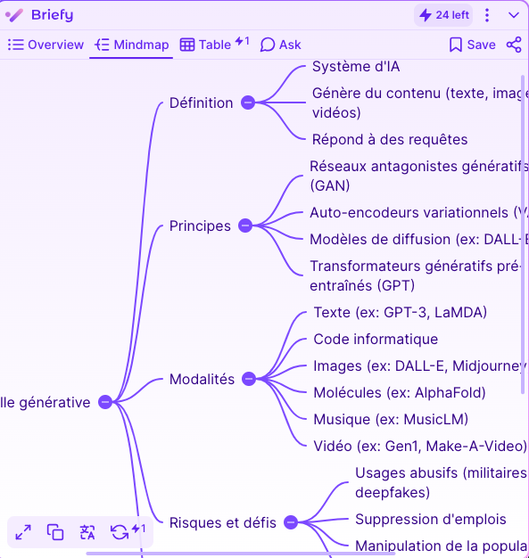 Briefy (https://briefy.ai) résume des pages web via une extension Chrome ou Safari iOS. 3 formats sont proposés – texte, carte heuristique ou tableau – et un chatbot est disponible. Partage possible.