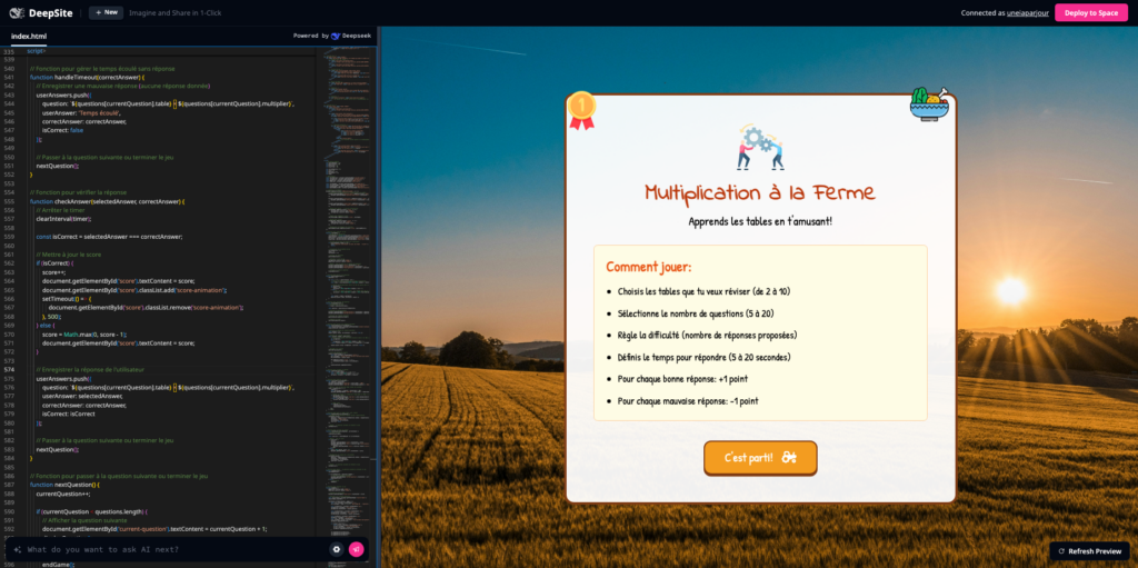 Deepsite (https://huggingface.co/spaces/enzostvs/deepsite) génère une page de code unique à partir d’une instruction pour créer des applications ou pages web. Le...
