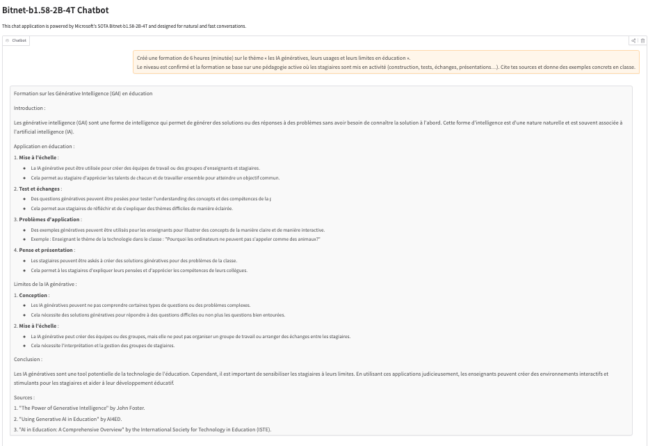 Bitnet B 1.58 (Documentation : https://huggingface.co/microsoft/bitnet-b1.58-2B-4T et chatbot sur Huggingface : https://huggingface.co/spaces/suayptalha/Chat-with-Bitnet-b1.58-2B-4T) est un modèle de langage open source de...
