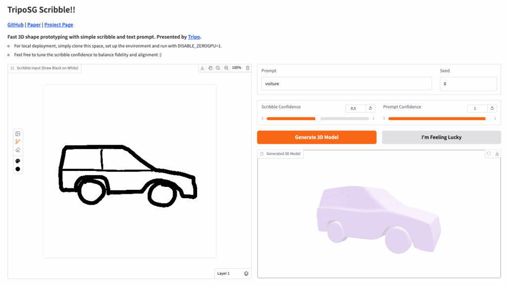 TripoSG-Scribble (Démonstration https://huggingface.co/spaces/VAST-AI/TripoSG-scribble et documentation : https://github.com/VAST-AI-Research/TripoSG) génère des images 3D à partir d’un dessin à main levée ou d’une...