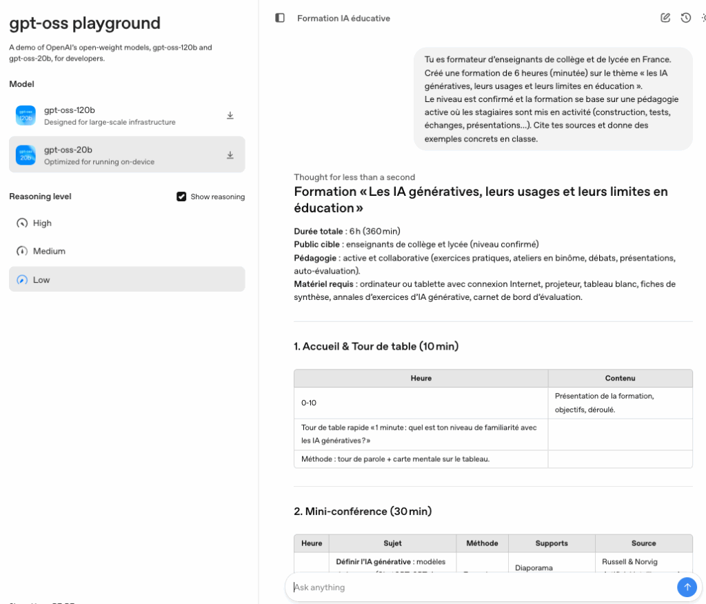 Gpt-oss (démonstration : https://gpt-oss.com/ et documentation : https://huggingface.co/collections/openai/gpt-oss-68911959590a1634ba11c7a4) : deux modèles de langage open source produits et mis à disposition...